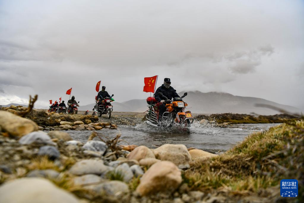 2023年6月2日,在平均海拔超过5000米的西藏日喀则市萨嘎县昌果乡,昌果乡护边联防队队员骑着摩托车巡逻。昌果乡是与尼泊尔接壤的边境乡,有105公里的边境线,5条通外山口。昌果边防工作站成立于1997年,参加护边联防队被当地牧民视为一种荣誉。在27年的时间里,一支由普通牧民组成的护边联防队在不断成长壮大的过程中,让国旗飘扬在国境线的每个角落。