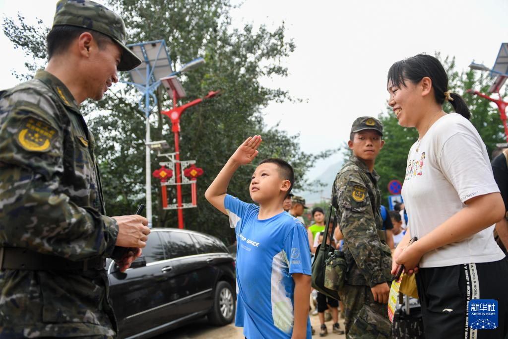 2023年8月2日,在北京市门头沟区妙峰山镇,在乘坐车辆转移前,来自内蒙古的三年级小学生武天骐(中)向武警北京总队机动三支队的王雷鸣敬礼感谢。
