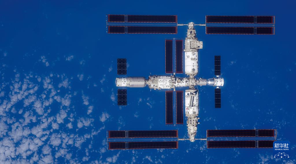 2023年11月28日,中国载人航天工程首次对外发布由神舟十六号乘组返回地面前手持高清相机,通过飞船绕飞拍摄的空间站组合体全景照片。这是我国首次在轨获取以地球为背景的空间站组合体全貌图像,也是中国空间站的第一组全构型工作照。