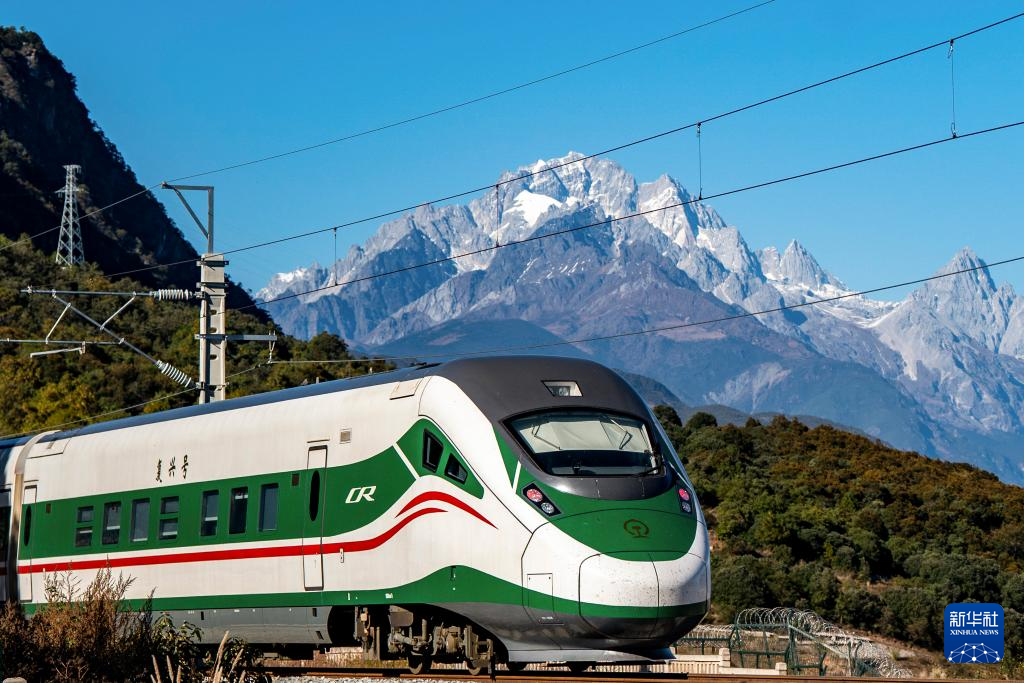 2023年11月26日,云南丽江至香格里拉铁路开通运营,两地间最快1小时18分可达,昆明经大理、丽江可直达香格里拉,这是列车从玉龙雪山脚下驶过。