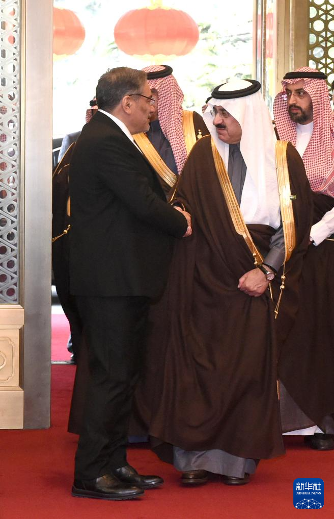 2023年3月6日,沙特国务大臣兼国家安全顾问艾班(右二)和伊朗最高国家安全委员会秘书沙姆哈尼(左一)在举行对话前握手。在中方支持下,沙特和伊朗于3月6日至10日在北京举行对话,并于3月10日达成北京协议,中沙伊三方签署并发表联合声明,宣布沙伊双方同意恢复外交关系,强调三方将共同努力,维护国际关系基本准则,促进国际地区和平与安全。