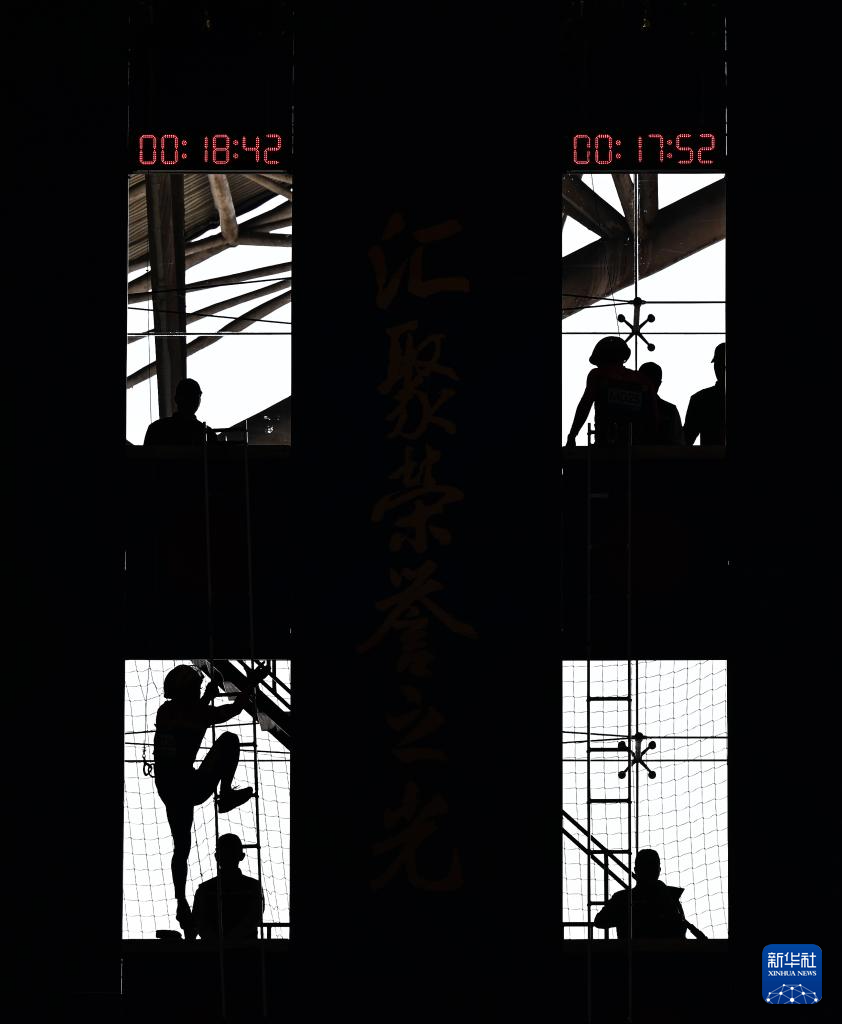 2023年11月8日,第二届全国消防行业职业技能大赛在江苏南京开幕,消防员参加攀登挂钩梯比赛。