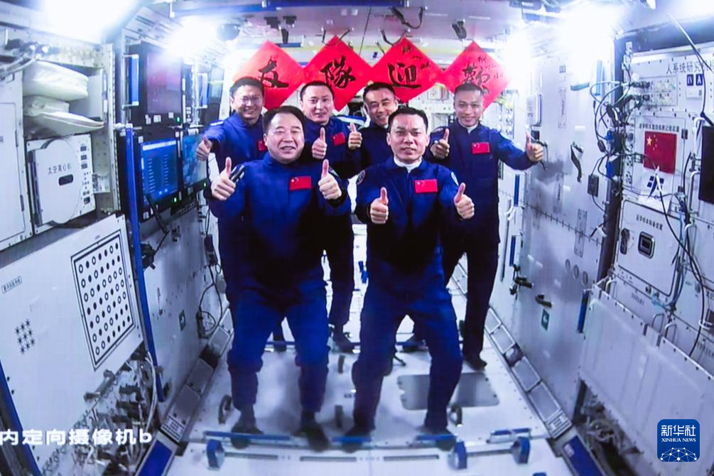 北京时间2023年10月26日19时34分,神舟十六号航天员乘组顺利打开“家门”,欢迎远道而来的神舟十七号航天员乘组入驻“天宫”。随后,两个航天员乘组拍下“全家福”,共同向全国人民报平安。这是10月26日在北京航天飞行控制中心拍摄的神舟十六号航天员乘组与神舟十七号航天员乘组“全家福”。