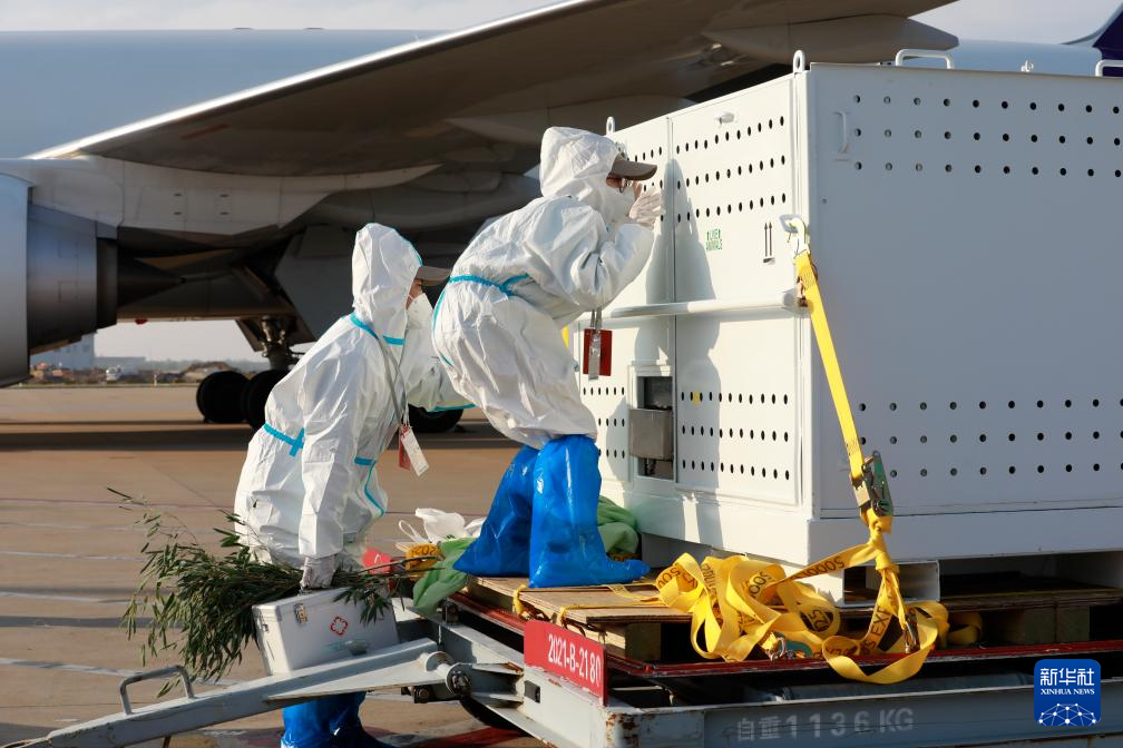 2023年4月27日,23岁的旅美归国大熊猫“丫丫”抵达上海浦东国际机场,在中方兽医和工作人员的陪护下,前往封闭隔离检疫区。这是中方兽医在检查旅美归国大熊猫“丫丫”情况。