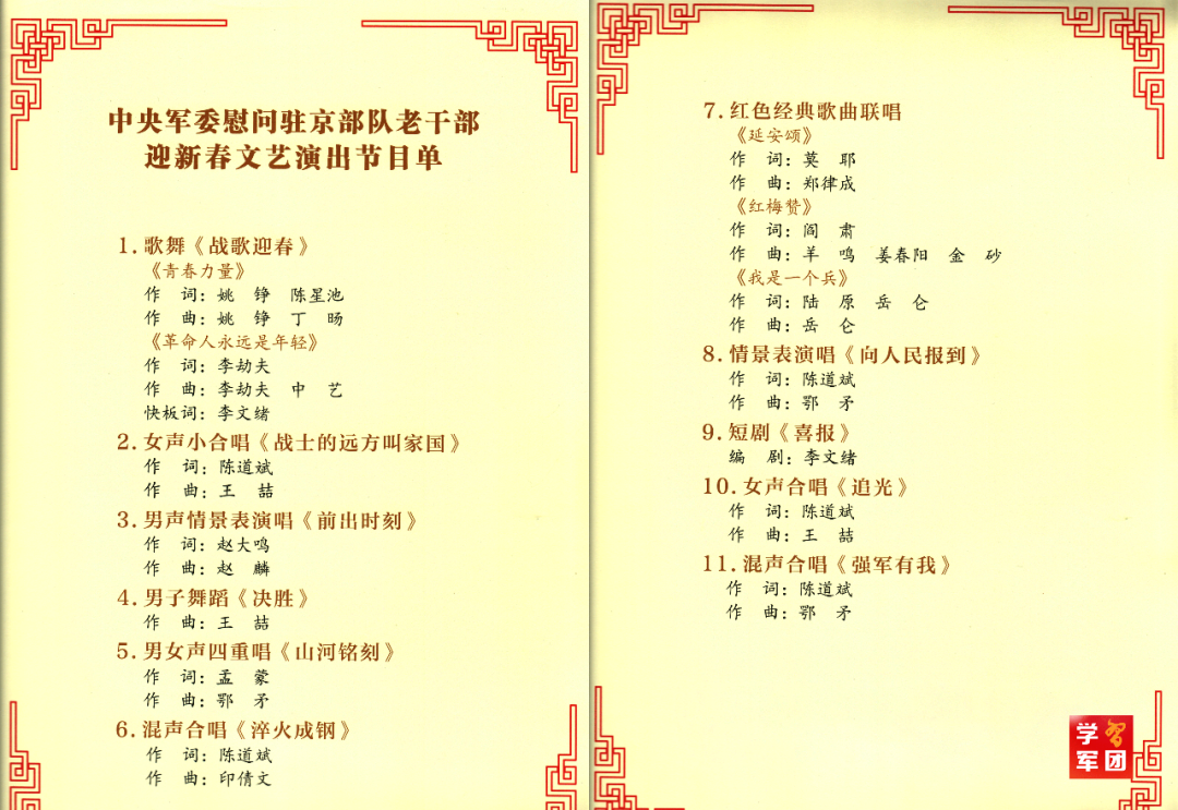 “新的时代、新的征程,新的一年新目标”,歌舞《战歌迎春》拉开演出序幕,营造出喜庆热烈的节日氛围。