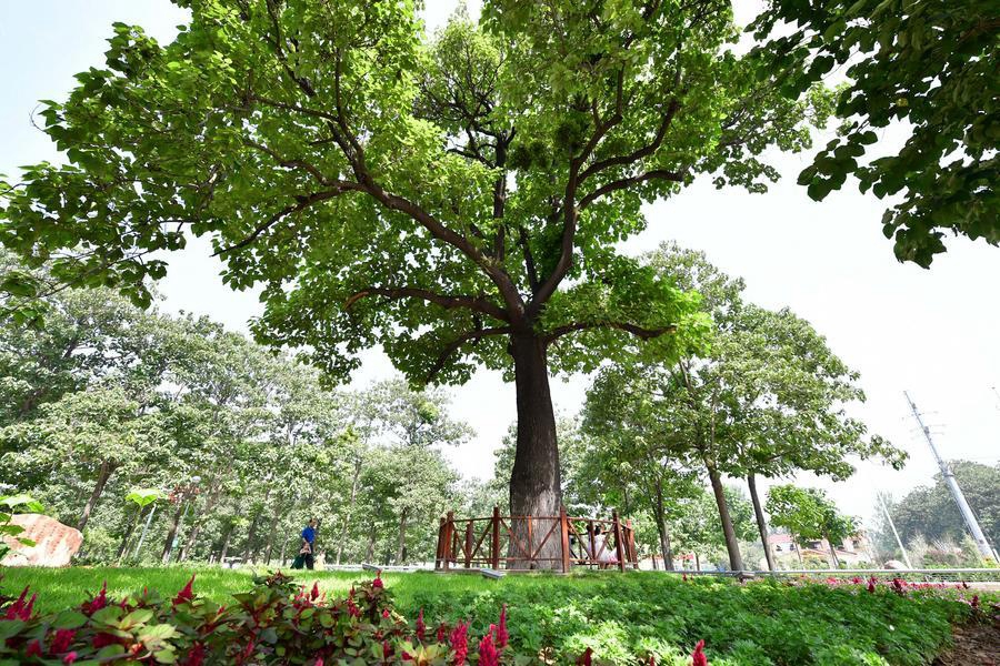 在河南兰考县焦裕禄干部学院门口,游客从“焦桐”下走过(2017年8月9日摄)。新华社记者 冯大鹏 摄