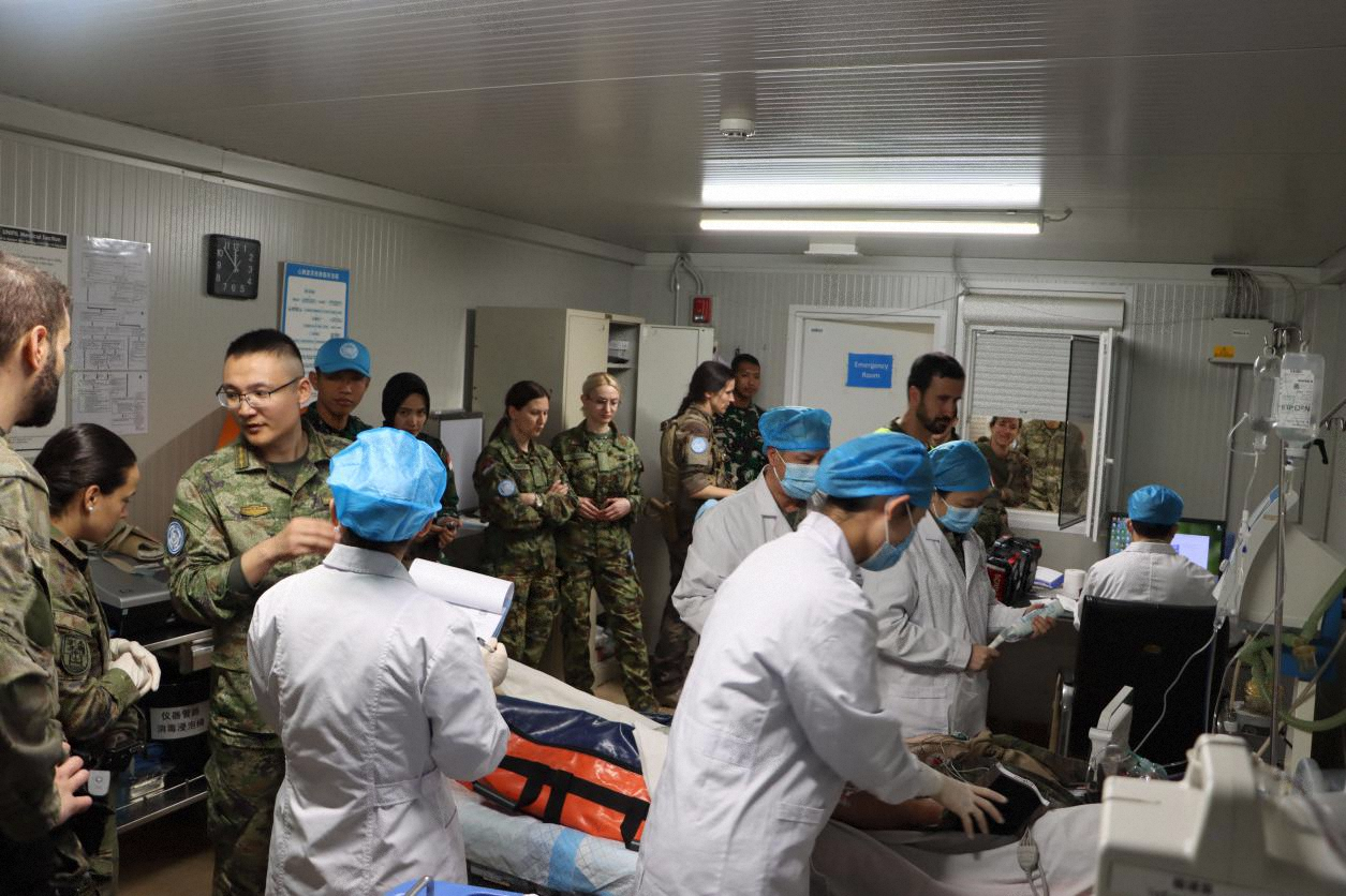 “中国维和医院,这里是东区作战指挥中心,有1名‘伤员’位于中国医院西北2公里处,请迅速做好‘伤员’前接和救治准备。”中国维和医院作战值班室接到命令后,立即启动应急救援预案,组织救护车和医护人员前往事发地点,与各参演国医护人员一同对“伤员”进行检伤分类、信息采集、伤口包扎、止血固定、转移后送。经过近2个小时紧张有序的演练,各岗位成员协同完成各项联合救治演练内容。