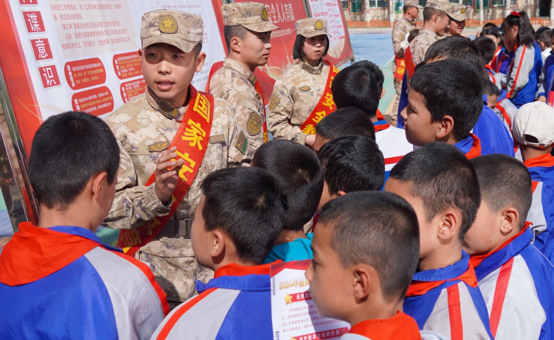 4月12日,新疆军区某火力团组织官兵走进驻地小学进行国家安全教育基本知识普及。