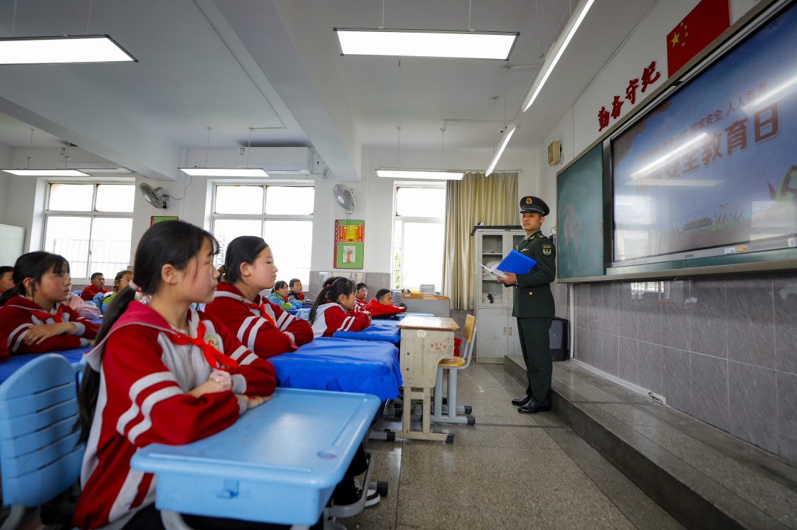 4月12日,联勤保障部队某部安全教育宣讲骨干走进驻地小学,为学生普及国家安全教育基本知识。