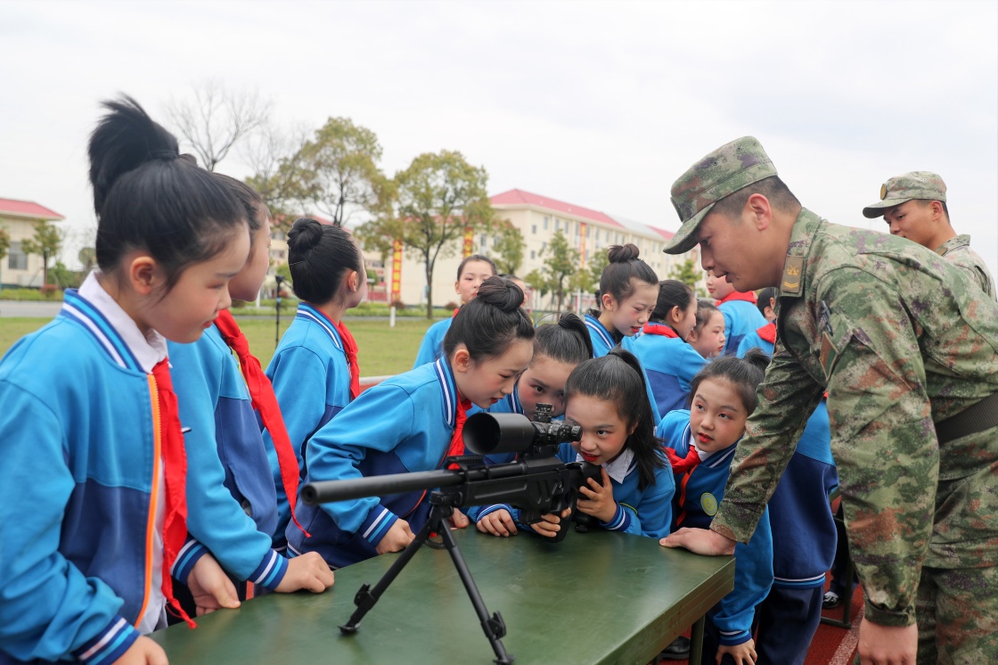 4月12日,陆军第72集团军某旅开展“百名学子进军营、同心共筑国安梦”国家安全教育主题活动,学生们在官兵指导下近距离体验单兵武器装备。