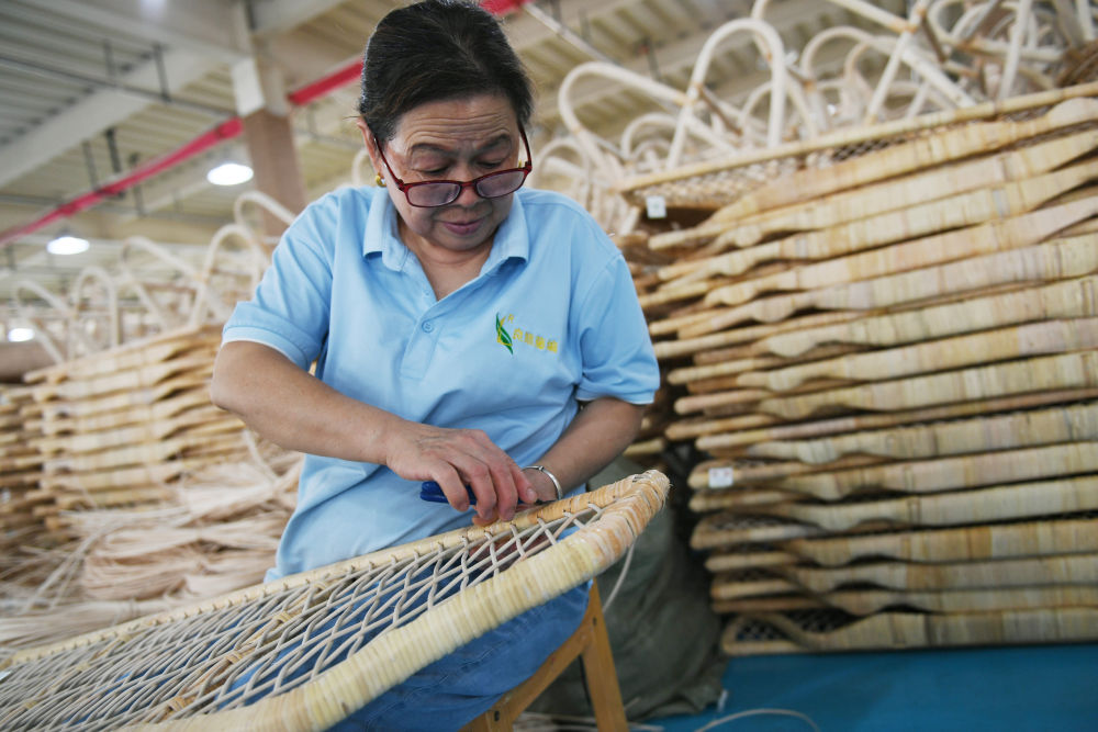 2023年9月7日,在位于汉中市的陕西良顺匠心实业有限公司,工作人员在编织藤制品。新华社记者 张曼怡 摄