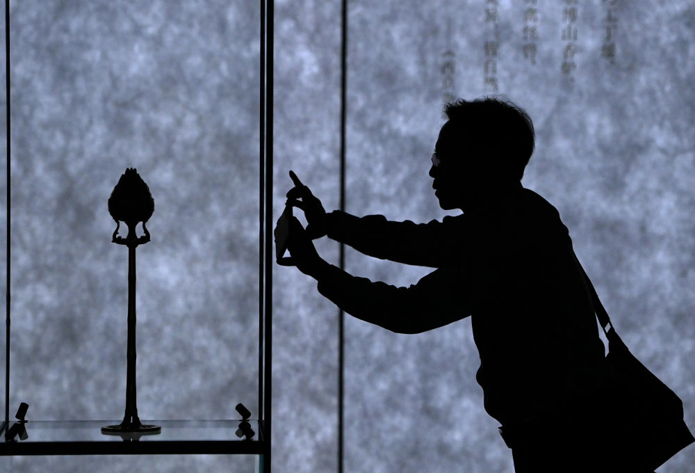 2024年5月18日,观众在陕西历史博物馆秦汉馆观看“技与美”专题陈列上展出的西汉鎏金银竹节铜熏炉。新华社记者 李一博 摄