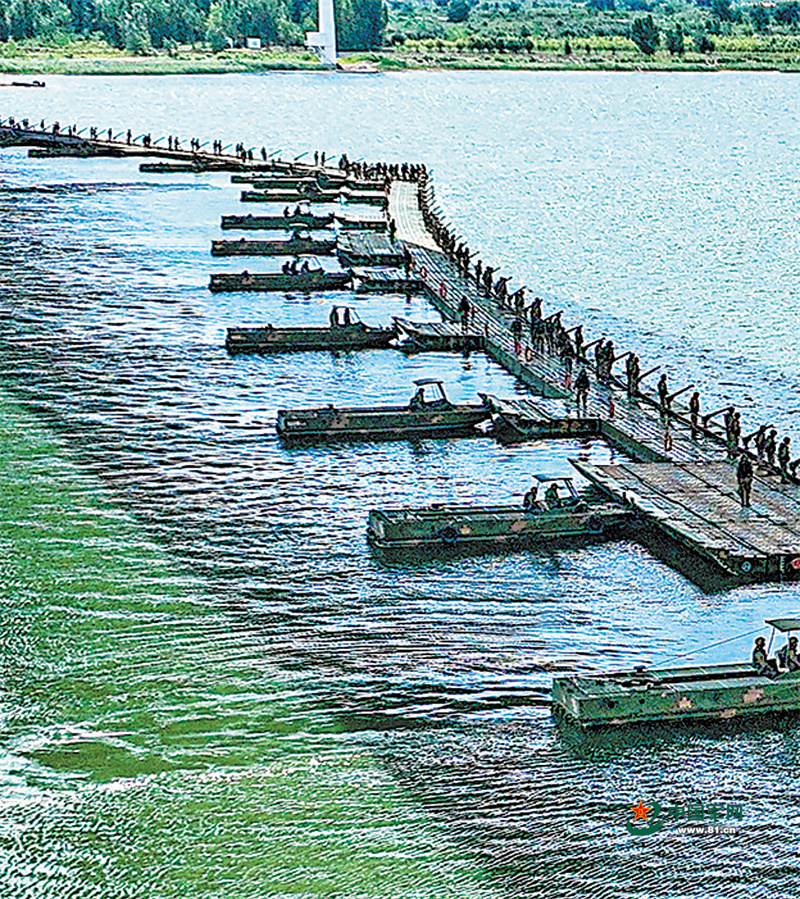 各门桥长手举指挥旗,指挥官兵不断修正门桥姿态和汽艇航速,门桥一节一节衔接成功。最后,顶推闭塞门桥的汽艇驾驶员几经调整,将闭塞门桥引入桥轴线。作业手迅速卡位、旋接,浮桥成功合龙,横亘在宽阔河面上。