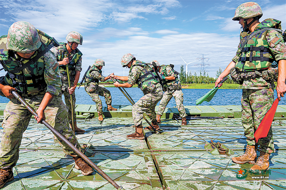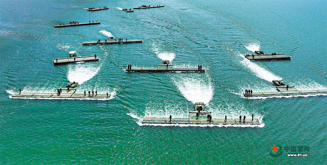 “开始作业!”指挥员一声令下,多辆舟车在预定位置卸载门桥。重达数吨的门桥滑入水中后,铺展在水面上。随后,作业手迅速将门桥与汽艇连接固定。汽艇驾驶员操控汽艇,克服水流变化带来的不利影响,开足马力将门桥顶推至架设位置。