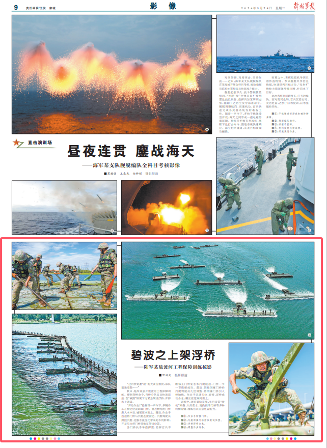 秋日,陆军某旅开展渡河工程保障训练。接到架桥命令,舟桥分队官兵快速前出,在“被毁”桥梁下方紧急架设浮桥,开辟水上通道。