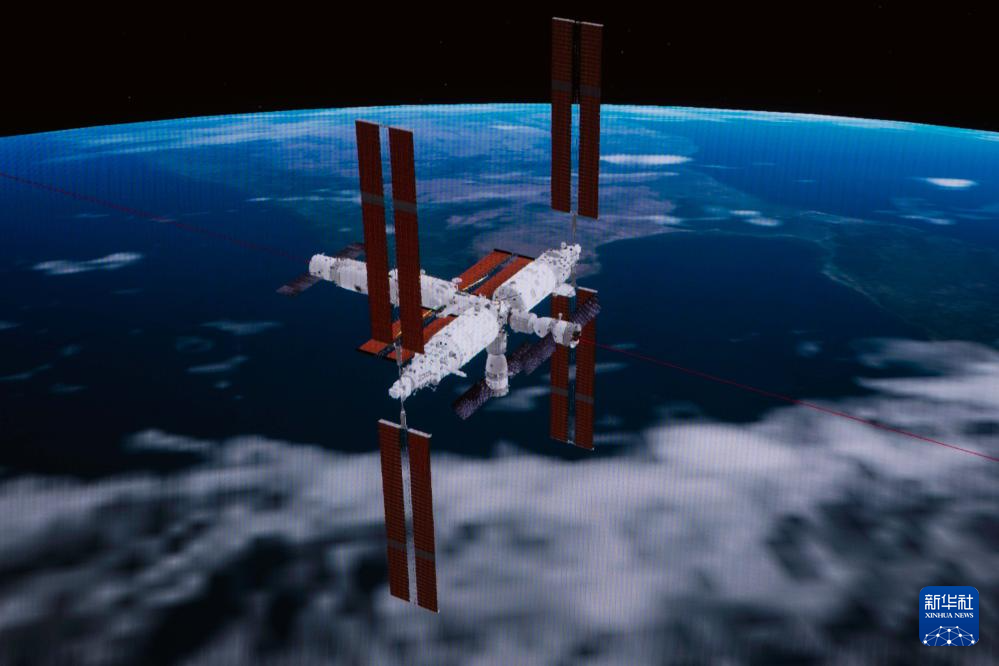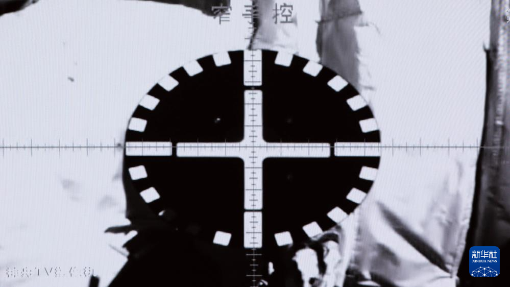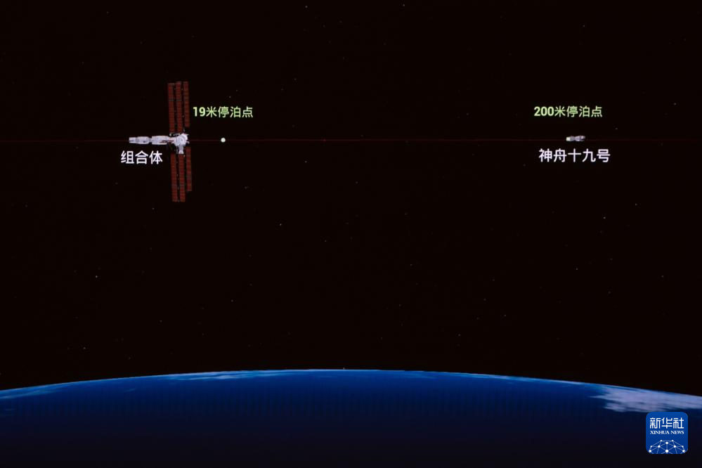 10月30日在北京航天飞行控制中心拍摄的神舟十九号载人飞船和空间站天和核心舱前向端口对接过程的画面。新华社发(韩启扬 摄)