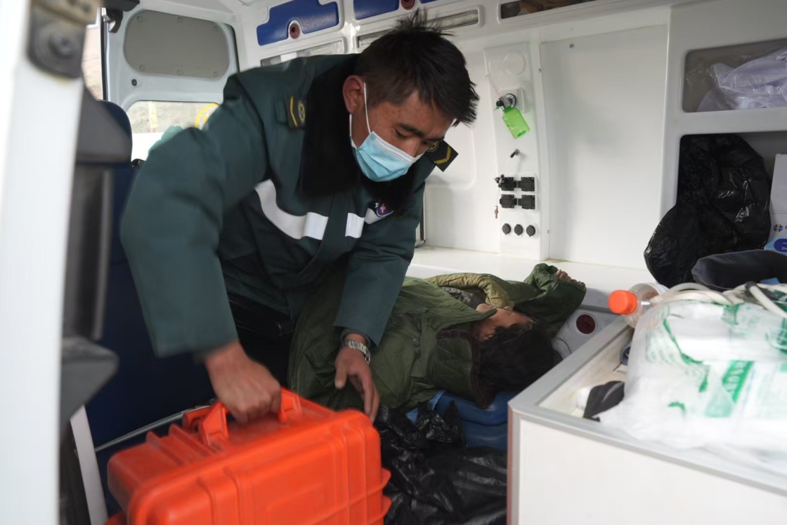 1月7日,在定日县长所乡古荣村,工作人员在救护车里工作。新华社记者 晋美多吉 摄