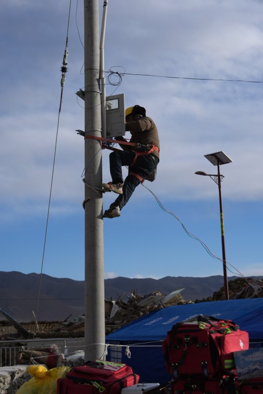 1月7日,在定日县长所乡古荣村,工作人员在抢修供电线路。新华社记者 晋美多吉 摄