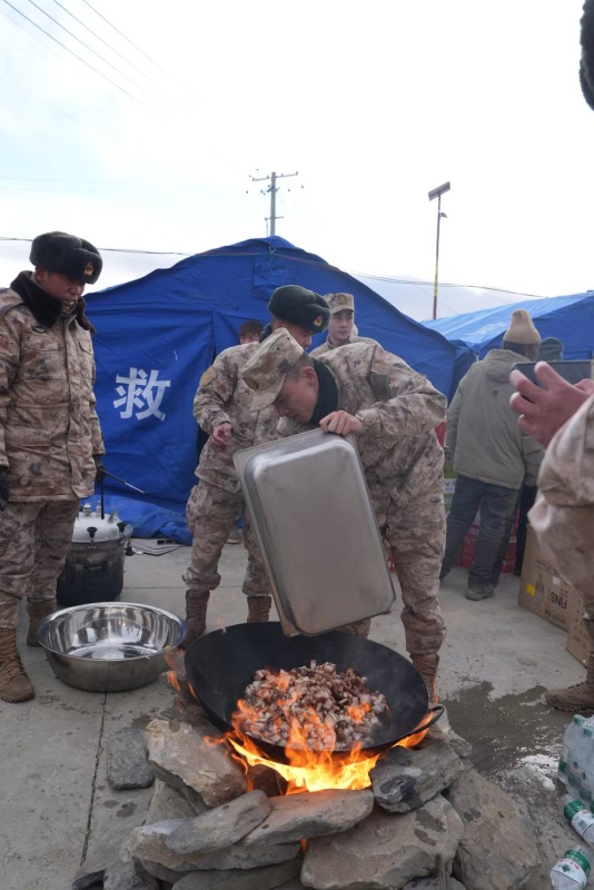 1月7日,在定日县长所乡古荣村,救援人员在准备晚饭。新华社记者 晋美多吉 摄
