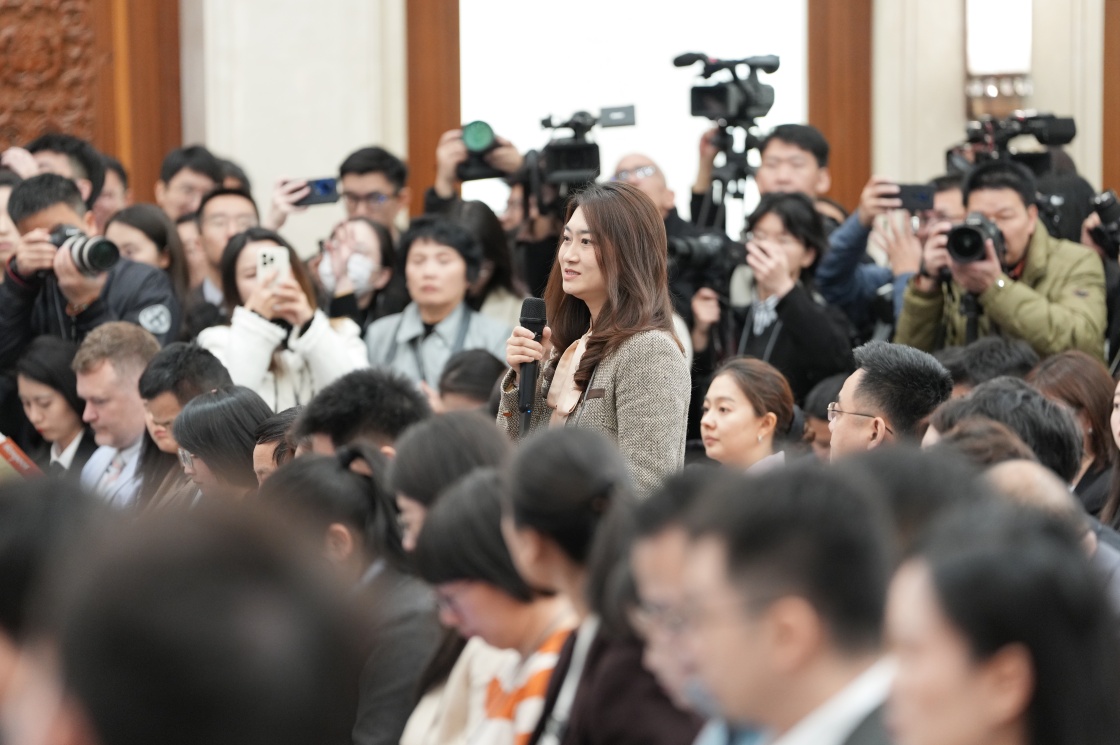 3月4日,十四届全国人大三次会议在北京人民大会堂举行新闻发布会。大会发言人娄勤俭就大会议程和人大工作相关问题回答中外记者提问。这是新华社记者在发布会上提问。新华社记者 陈晔华 摄