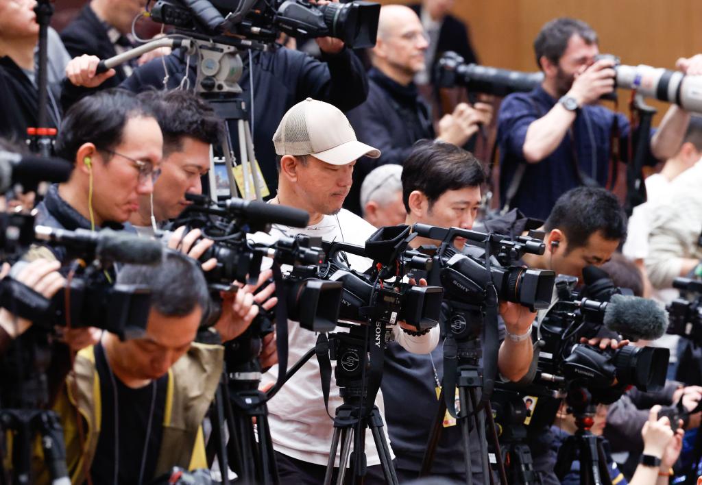 3月10日上午,中国人民政治协商会议第十四届全国委员会第三次会议在北京人民大会堂闭幕。这是记者在会场采访。