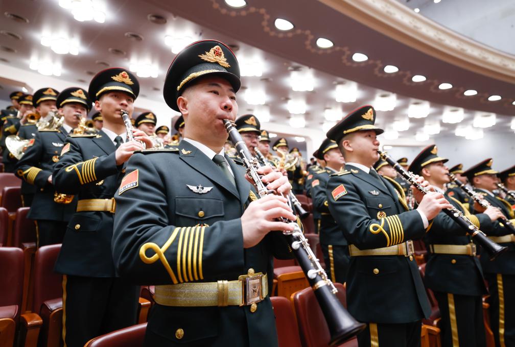 3月10日上午,中国人民政治协商会议第十四届全国委员会第三次会议在北京人民大会堂闭幕。这是军乐团在演奏。