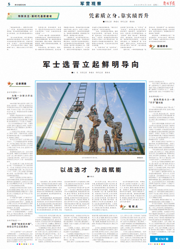 建章立制,一项项举措传递着“凭素质立身,靠实绩晋升”这一相同的信号,越来越多的战士意识到:成长没有捷径、进步没有后门,唯有踏实奋斗才能迎来广阔前景。