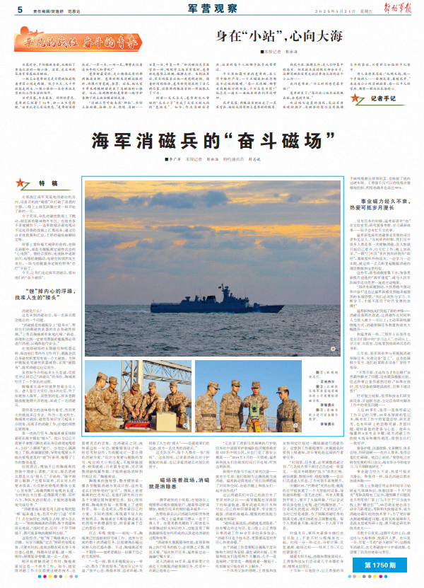 “一笔一画,都关系舰艇安全;一举一动,都为了胜战服务。”他在日记中写道,“放平心态、练强本领、追求卓越,我找准了人生的‘接头’——沿着前辈们的足迹,成为一名优秀的消磁兵。”