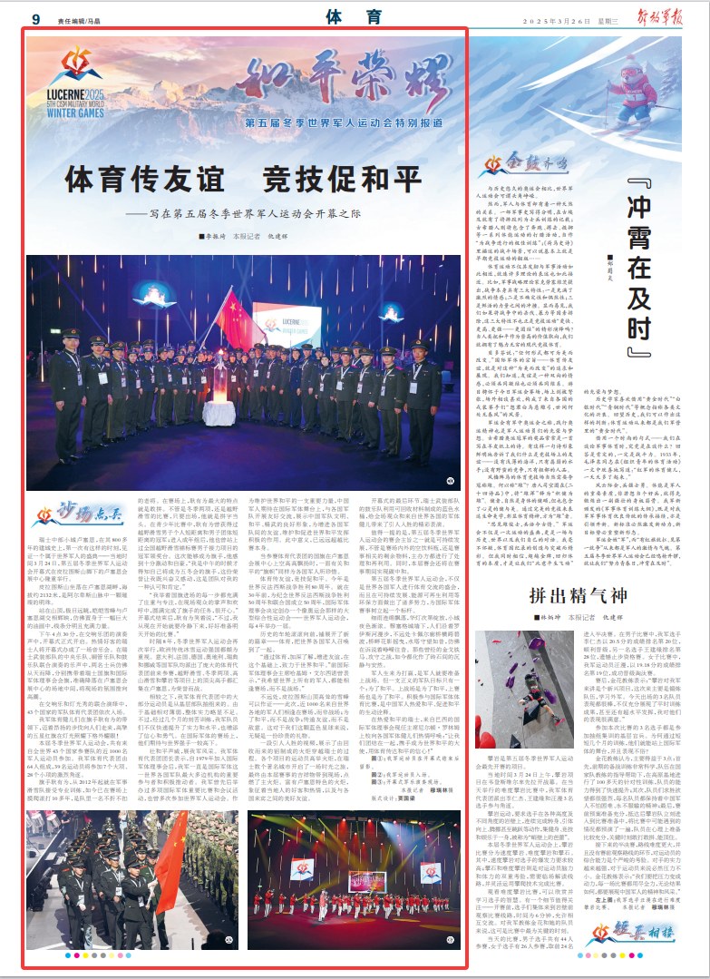 当参赛体育代表团的国旗在卢塞恩会展中心上空高高飘扬时,一面有关和平的“旗帜”同样为各国军人所珍惜。