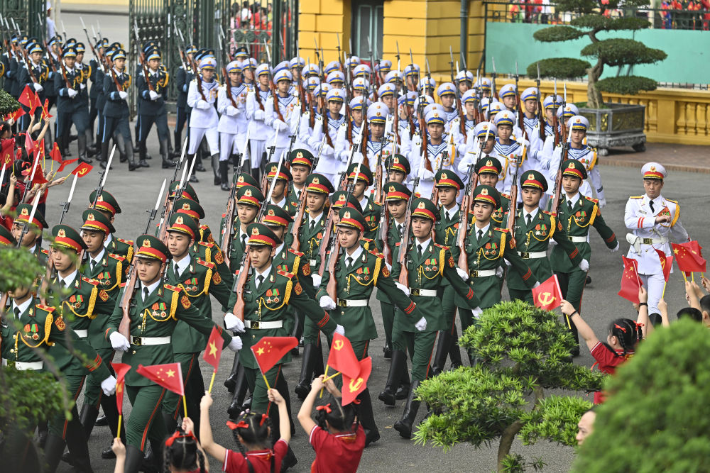当地时间4月14日,中共中央总书记、国家主席习近平在河内出席越共中央总书记苏林举行的欢迎仪式。