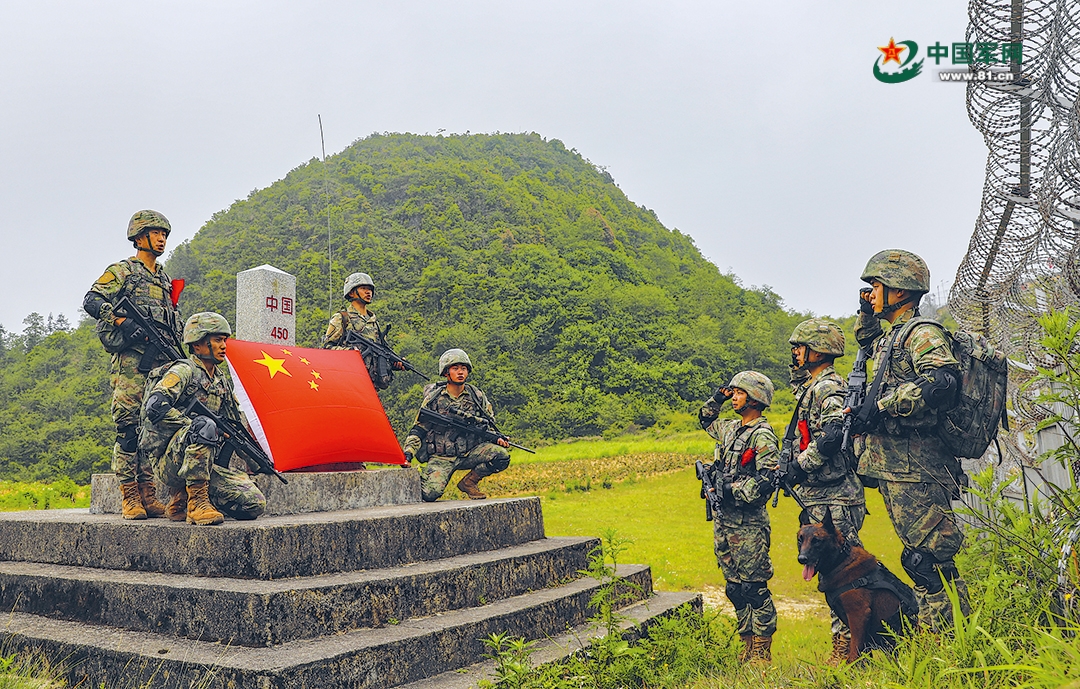 巡逻官兵在界碑前面对国旗庄严宣誓。