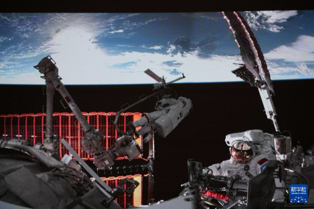 这是12月9日在北京航天飞行控制中心屏幕上拍摄的神舟二十一号乘组航天员张陆与武飞(右)在舱外工作的画面。