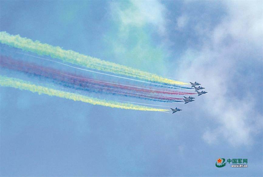 11时许,在现场观众热切期待下,六架喷涂中国国旗与八一军徽的歼-10表演机出现在海面上空,随着六机超密集编队低空通场,海天之间留下的红、黄、蓝三色彩烟将天空点缀得格外绚烂。