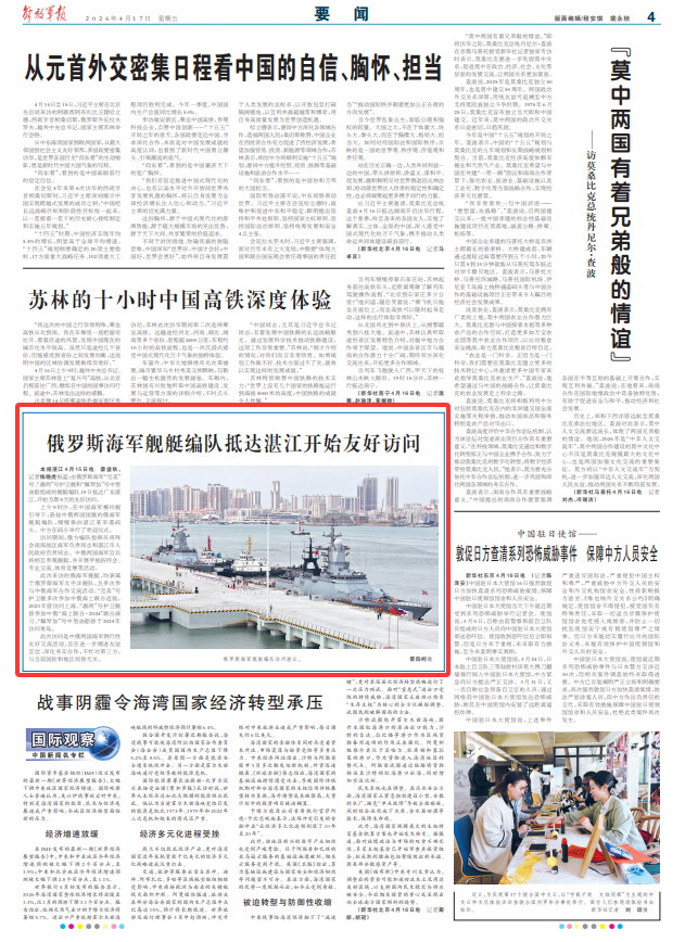 解放军报湛江4月15日电 蔡盛秋、记者钱晓虎报道:由俄罗斯海军“完美”号、“凛冽”号护卫舰和“佩琴加”号中型油船组成的舰艇编队15日抵达广东湛江,开始为期5天的友好访问。