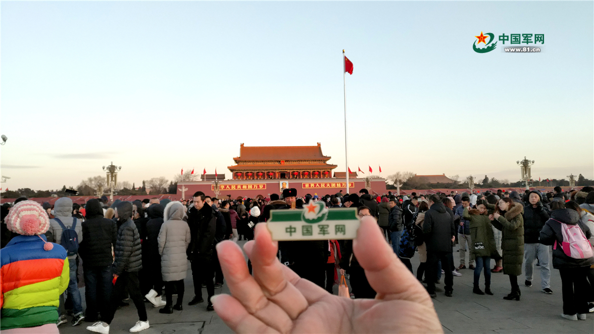 2018年1月1日清晨,北京天安门广场举行隆重的升国旗仪式。来自全国各地的数万名群众现场观看升国旗仪式,迎接2018年的到来。现场观众看到中国军网记者身上佩戴的胸牌后,纷纷要求和“中国军网”胸牌拍照留念。中国军网记者孙智英 摄