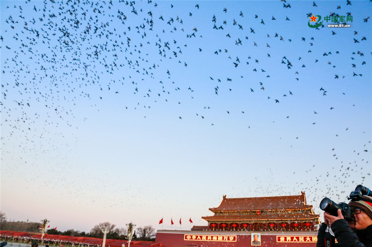 国旗升起的那一刻,和平鸽在天安门广场上空翱翔。中国军网记者 冯开华 摄