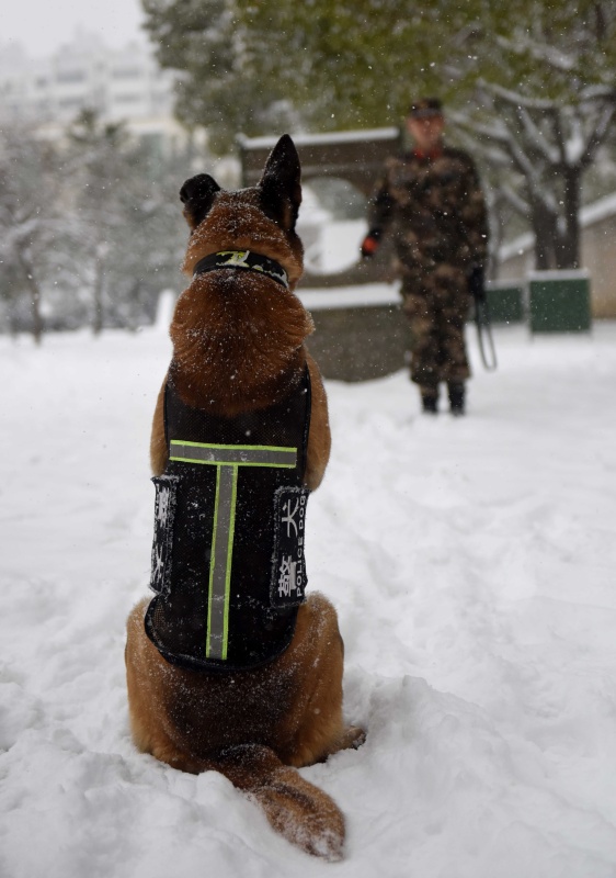 武警安徽总队机动支队警犬班战士王营广带领“鲁克”进行坐卧立等服从性训练。