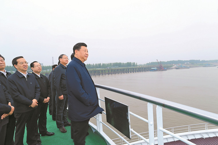 4月26日下午,中共中央总书记、国家主席、中央军委主席习近平在武汉主持召开深入推动长江经济带发展座谈会并发表重要讲话。这是座谈会前,习近平于25日上午乘船沿江察看两岸生态环境和发展建设情况。新华社记者 谢环驰 摄