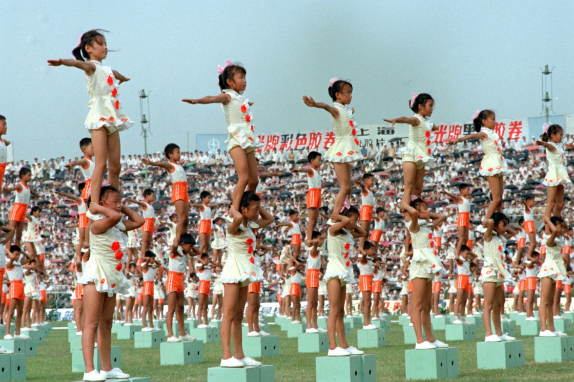 少年儿童在上海举行的第五届全运会开幕式上表演文体节目(1983年9月摄)。新华社记者