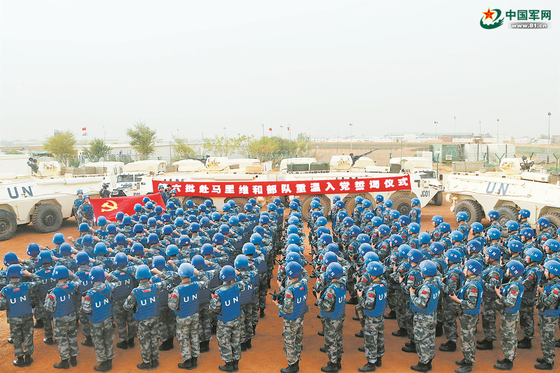 当地时间6月30日,中国第6批赴马里维和部队党员面向党旗庄严宣誓,纪念中国共产党成立97周年。贾春明摄
