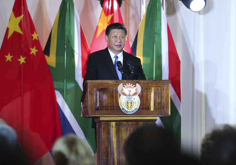 7月24日,国家主席习近平在比勒陀利亚出席南非总统拉马福萨举行的欢迎习近平主席对南非进行国事访问暨庆祝中南建交20周年晚宴。这是习近平发表致辞。新华社记者 谢环驰 摄