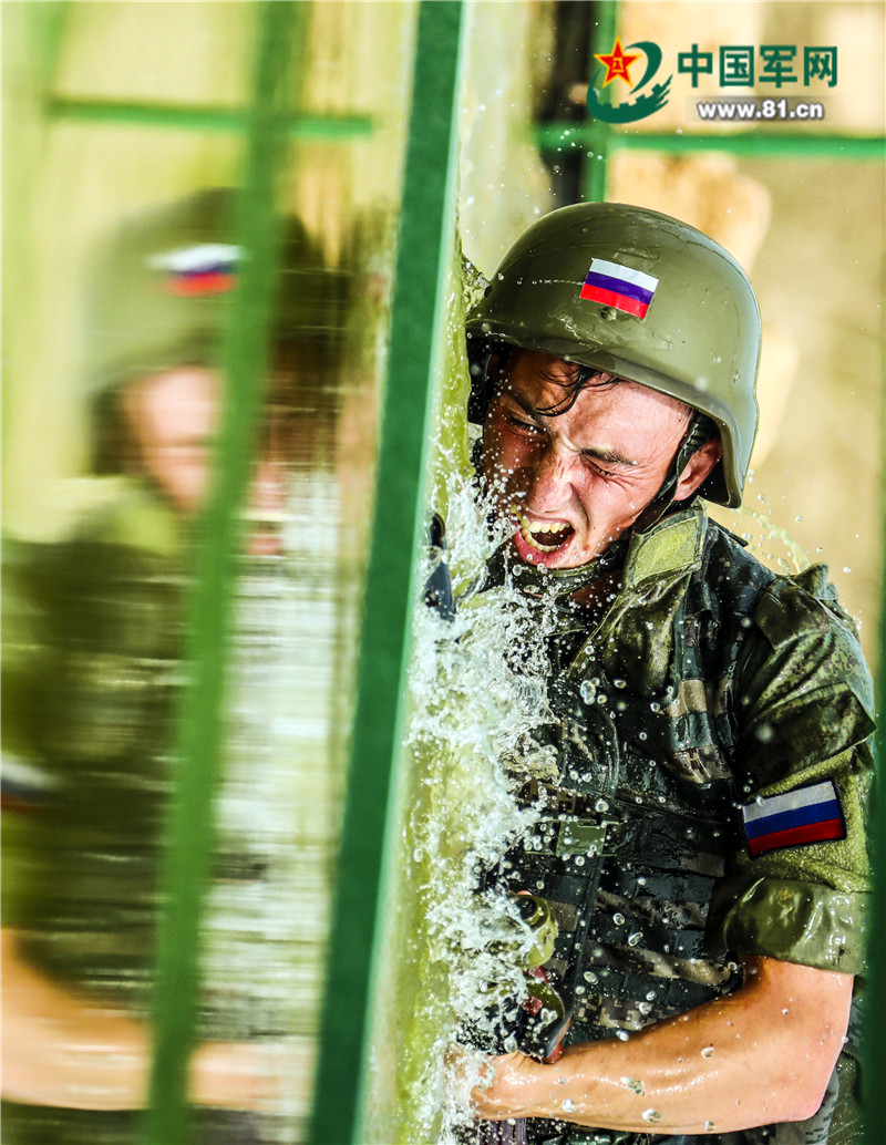 俄罗斯参赛队员通过低桩铁丝网。孙宏韬摄