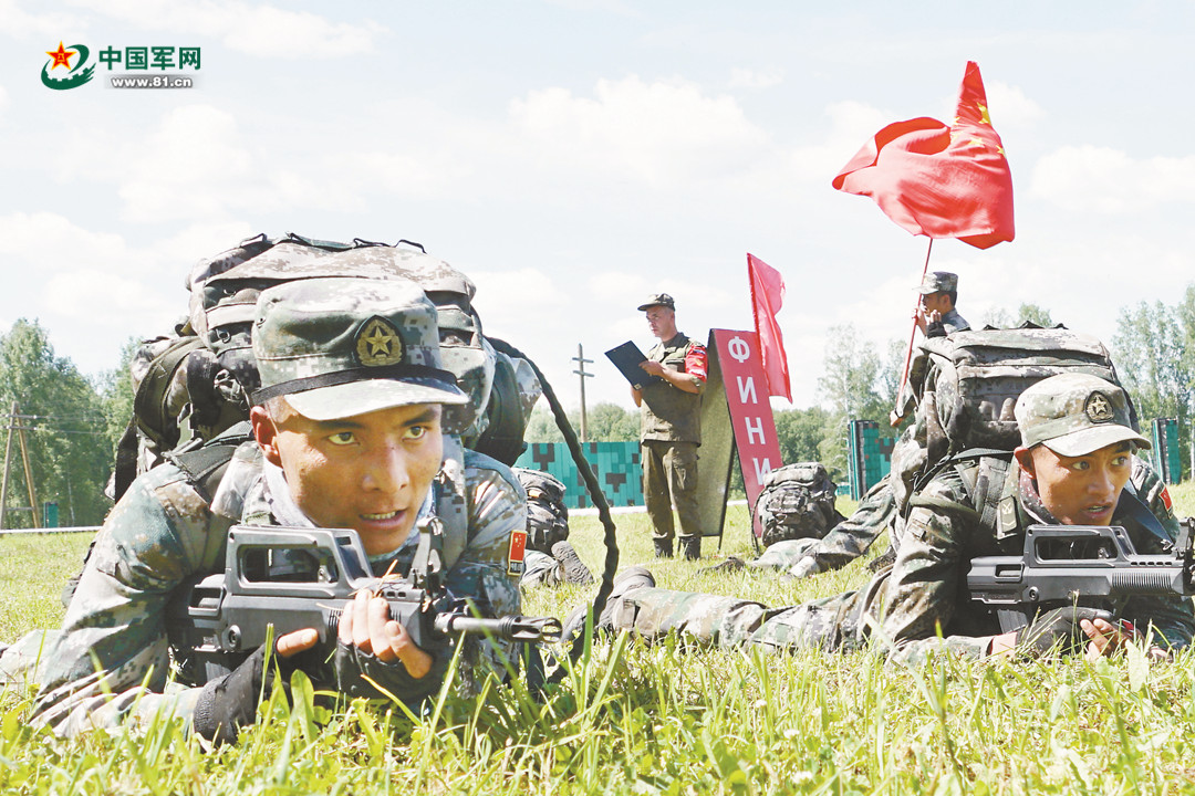 我军参赛队员在“侦察尖兵”项目比赛中观察“敌”情。