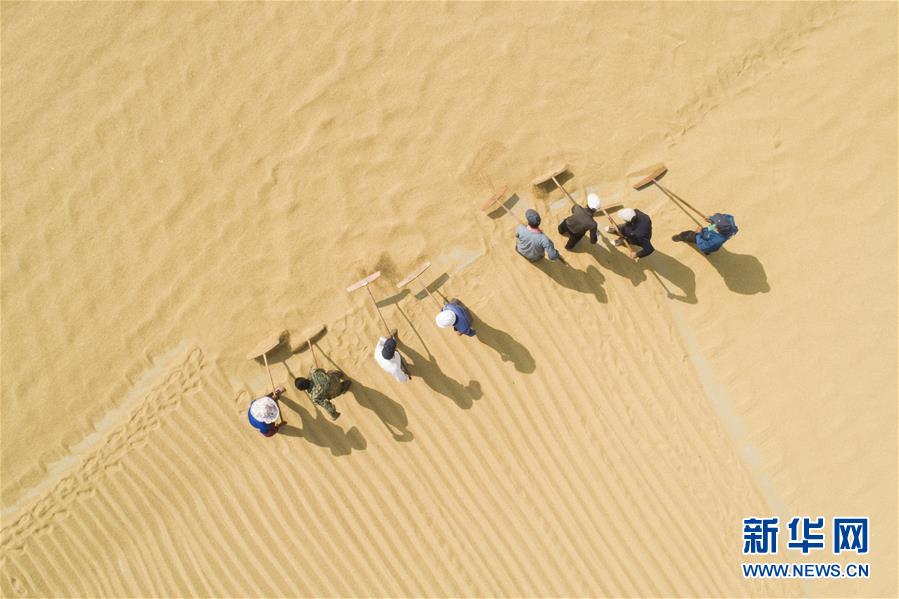 10月21日,江苏省海安农场的农民在翻晒稻谷(无人机拍摄)。 新华社发(徐劲柏 摄)