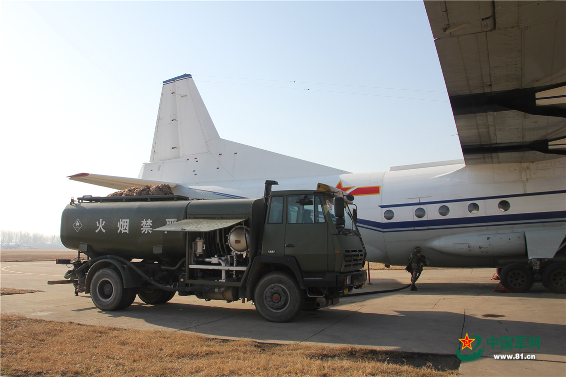 联勤保障部队的油罐车直接开上停机坪,为空军运输机加注航空燃油。