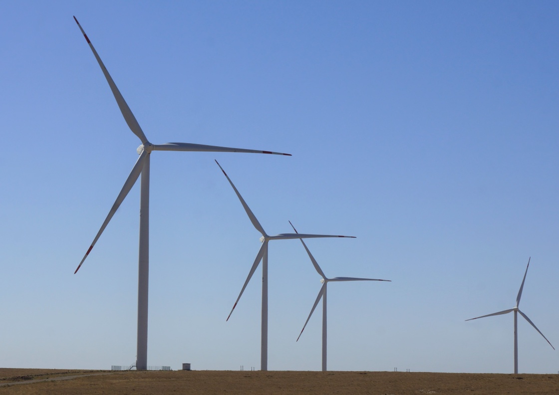 这是哈萨克斯坦札纳塔斯风电场风机(2022年9月13日摄)。札纳塔斯100兆瓦风电项目是中哈合作的中亚最大风电项目。新华社发(德米特里·瓦西连科摄)