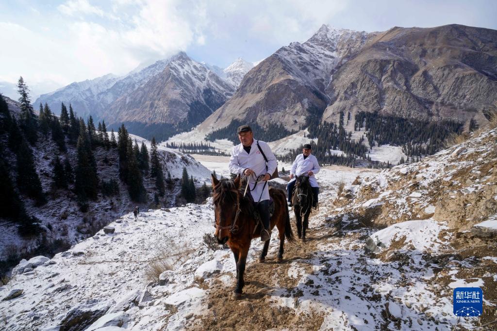 2022年1月25日,在新疆昭苏县的冬季牧场阿合牙孜沟,牧业医院的医生骑马巡诊。