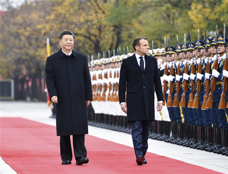11月6日,国家主席习近平在北京人民大会堂同法国总统马克龙会谈。这是会谈前,习近平在人民大会堂东门外广场为马克龙举行欢迎仪式。新华社记者 燕雁 摄