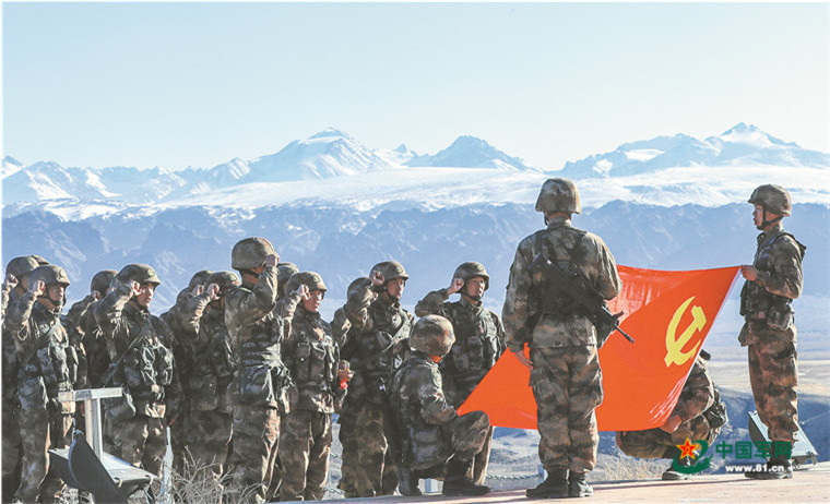 登上“胜利峰”,官兵们面对鲜红的党旗庄严宣誓。