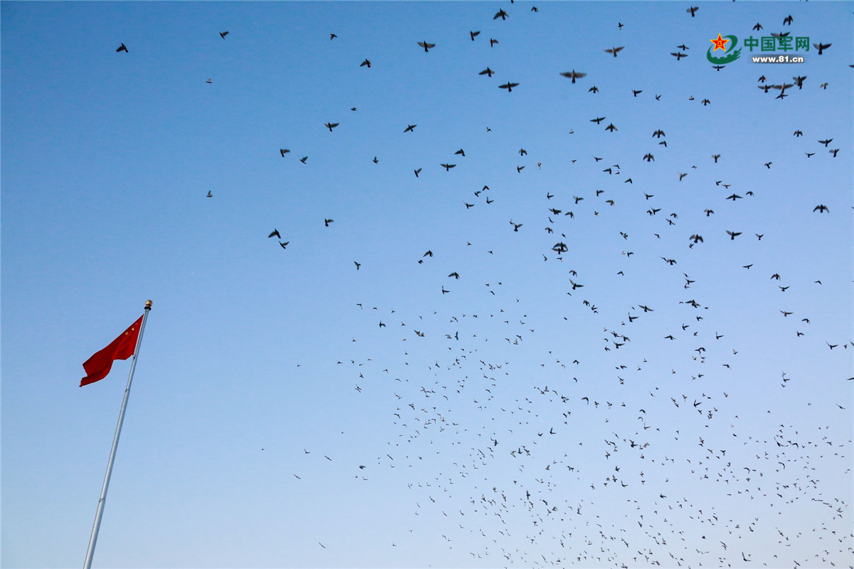 和平鸽绕着国旗翱翔。中国军网记者 冯开华 摄